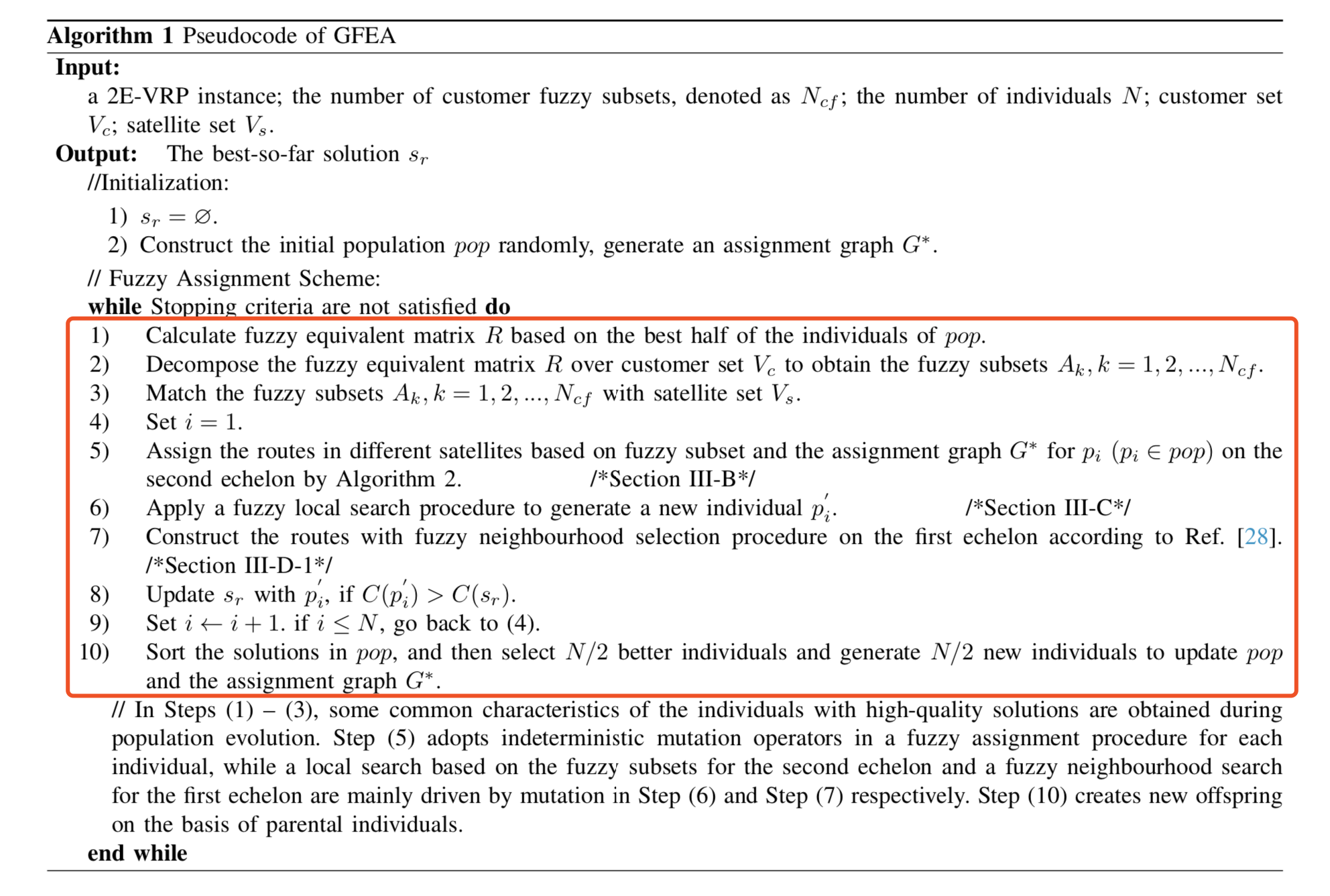 图一 2E-VRP可行解示意图 如图一所示,2E-VRP可以用一个加权的无向图G(V, E)来表示,其中V和E分别代表顶点集和边集。顶点集V由仓库节点V0、m个中转站的子集VS和n个用户的子集Vc组成; 边集E = {E1,E2},其中,E1为第一层路径组成的边子集,E2为第二层路径组成的边子集。2E-VRP问题可以简单理解为在给定约束条件下设计第一层和第二层路线的整体规划。然而考虑到不同运输层的车辆数以及车辆的载重量有所差异,第二层路径上的VRP子问题个数往往是不确定的,因而仅仅通过距离信息或其他简单的信息是很难将第一层与第二层的VRP子问题完全分离,这就给构建双层次物流配送系统的研究带来了巨大的挑战。不仅如此,随着2E-VRP问题规模的增加,中转站-用户之间的分配关系也会变得更加复杂。 针对上述问题,华南理工大学软件学院智能算法实验室提出一种基于图的模糊进化算法(GFEA)[1],该算法借鉴一些求解2E-VRP问题算法的优点,如ACOS[2],BSOA[3],BCA[4]等,从用户之间的模糊相关性出发,探索大规模物流配送路径问题的高质量可行解,为智慧城市的物流配送提供了技术支撑。目前该研究成果已成功发表在进化计算领域顶级国际学术期刊IEEE Transactions on Evolutionary Computation(JCR中科院一区,影响因子8.124)上。下面我们对本研究工作的相关成果展开介绍。