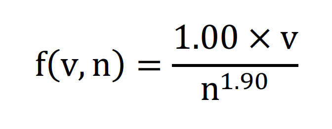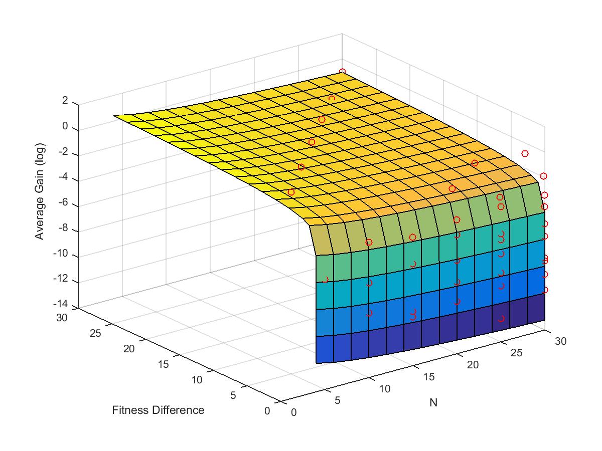 图八 取对数后平均增益关于问题维度及适应值差图 经过对平均增益数据点的拟合后,我们得到的拟合结果如公式一所示。然后根据平均增益模型定理二,可以推导出期望首达时间的上界,如公式二所示,从而得到所估算进化策略的时间复杂度。其中下面图九,图十分别展示了取对数值前后的样本点及其曲面拟合结果的图像。 公式一 最终得到的拟合结果