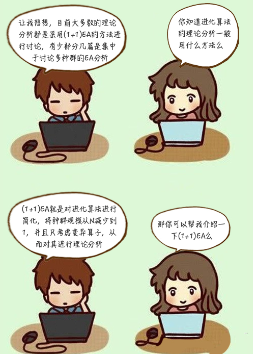 图十二 关于进化算法时间复杂度的讨论 让理论研究助力实际应用是智能算法实验室一直以来的目标,目前智能算法实验室计划搭建自动化的进化算法时间复杂度拟合平台,届时只需提供算法和问题的接口,由平台完成采样实验、曲面拟合、上界推导等工作,即可求得时间复杂度上界。正如上图十二漫画所示,之前使用数学推导来计算进化算法时间复杂度的艰难时代已经过去,现在只要你会编程就可以使用我们的方法来准确高效地分析其计算时间,从而真正打造出一项进化算法的“科学依据”——计算时间复杂度。 参考文献: