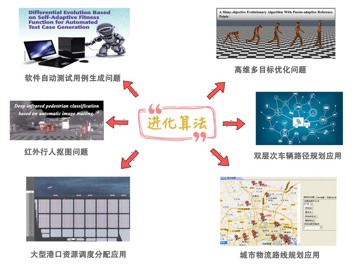 随着人工智能浪潮的迅猛发展,进化算法在诸多实际应用领域中都取得了显著的效果。在之前的推文中,我们介绍了进化算法常被用于求解高维多目标优化、软件测试用例自动生成以及红外行人抠图等不同领域的问题,也介绍了在实际应用中,进化算法被广泛用于双层次车辆路径规划、多个城市物流路线规划解决方案以及一些大型港口的资源调度分配问题解决等应用上,如图一进化算法的应用场景示例所示。