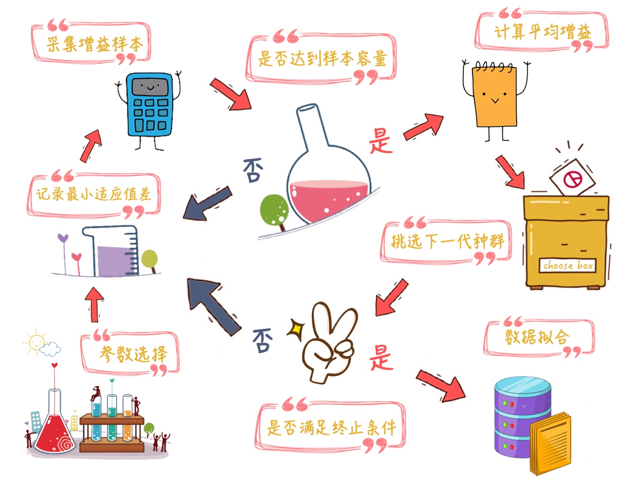 图五 所提估算方法与传统数学推导方法的区别 而本项研究中所提的估算方法则通过实验采样的方式来计算平均增益,从而避开了这个难点,两者的区别如图五所示。该采样实验的思路主要是在一次迭代中,令进化算法产生新解的过程独立地重复若干次,并分别计算新解的增益,从而用增益的平均值来估计增益的期望。上述实验的流程如图六所示,关于该方法的细节请参见引文[1]。