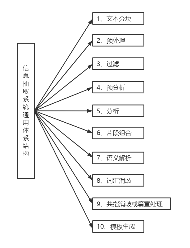 1993年Hobbs[1] J. Li, A. Sun, J. Han and C. Li, "A survey on deep learning for named entity recognition," IEEE Transactions on Knowledge and Data Engineering, vol. 99, pp. 1-20, 2020.提出信息抽取系统的通用体系结构,他将信息抽取系统抽象成十个模块,如图3所示。
