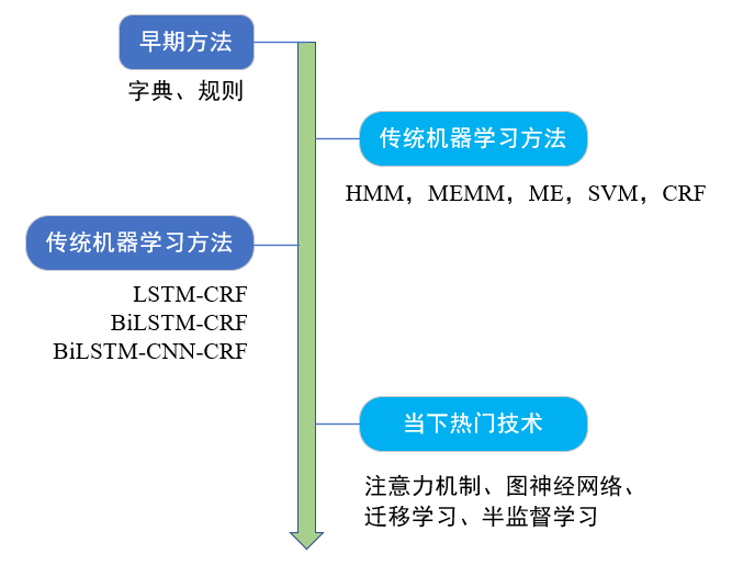 评价一个命名实体是否被正确识别有两个标准:第一,实体的边界是否正确;第二,实体的类型是否标注正确。命名实体识别的研究方法从早期基于词典和规则的方法,发展到传统机器学习的方法,再到基于深度学习的方法,一直到当下热门的注意力机制、图神经网络等研究方法。