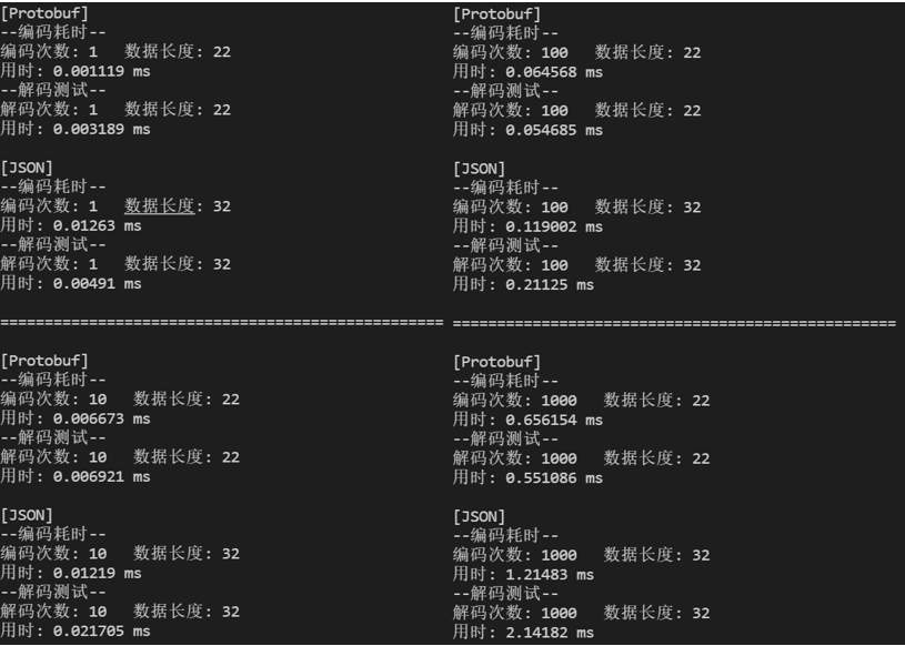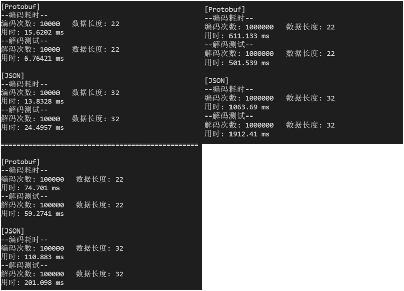 从上述测试结果我们可以看出,整体上ProtoBuf的编码效率为RapidJSON的2.99倍,ProtoBuf其的解码效率为RapidJSON的3.29