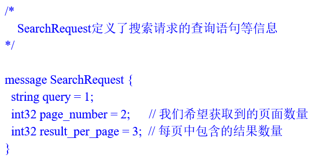 图1展示了一个简单的示例。我们定义了一个搜索请求消息,每一个搜索请求都包含了查询字符query、搜索请求返回的页面数量page_number和每页中的结果数量result_per_page。该示例的第一行声明了我们正在使用proto3。如果没有该行,ProtoBuf编译器将默认使用proto2。需注意,此该行一定要位于文件的第一非空及且非注释行。