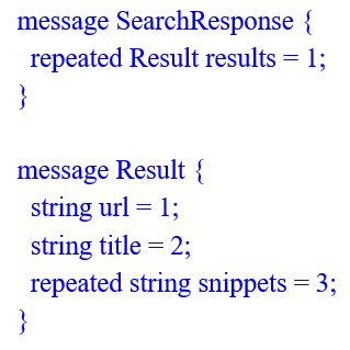 message中包含的字段类型除了默认支持类型外,还支持嵌套类型,即字段类型为所定义的其他message类型。如图2所示,我们在SearchResponse消息中包含了一个repeated修饰的Result类型字段。
