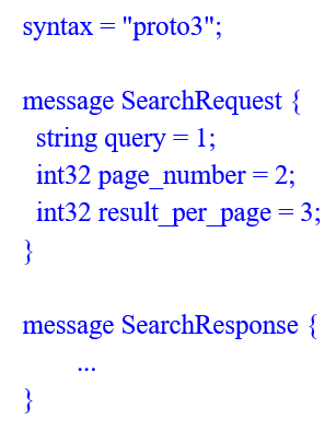 在同一个.proto文件中可以定义多个message类型,如图3所示,我们在该.proto文件中定义了SearchRequest和SearchResponse两个消息类型。与此同时,ProtoBuf也可以在不同的.proto文件中定义message,然后通过import语法进行引入。为了防止出现命名冲突的问题,.proto文件将通过引入package语法解决命名冲突的问题。