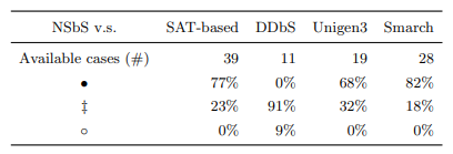 我们选择了39个真实的软件产品线作为实验对象以检验NSbS方法的效果。表1给出了包括NSbS在内的五个采样算法的平均运行时间,其中Timeout = 1小时。由表1可知,NSbS和基于SAT求解器的采样算法能处理所有软件产品线,可拓展性好。然而,除NSbS以外的其他算法均出现超时现象。比方说,最新的多样化采样算法DDbS(Diversified Distance-Based Sampling) [2] 仅能处理前11个小规模的SPL,在对剩下的SPL进行处理时均出现超时现象,这说明DDbS的可拓展性很差。