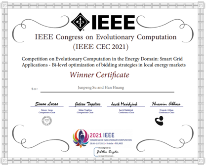 此外,在2021年IEEE进化计算大会(IEEE Congress on Evolutionary Computation, IEEE CEC)中,智能算法研究中心的研究人员针对智能电网优化问题而设计的两种微搜索算法[6]在比赛中脱颖而出,取得了优异的成绩。其中,区域电力市场竞价策略的双层优化算法在能源领域进化计算竞赛的智能电网应用赛道一上斩获桂冠,得到了国际权威的认可。