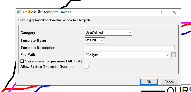 有时候我们可能需要绘制一些相同或者相似的图形,这时可以运用Origin的模板绘图功能,基于已完成绘制的统计图建立统计图模板,减少不必要的重复绘图,节省绘制时间。 以前文绘制完成的折线图为例,我们需要将其保存成模板。首先,点击菜单栏中的【File】选择【Sava Template As】选项,Origin即会弹出模板信息编辑界面,如图14所示。在本例中,我们将模板名称改为“MYLINE”,按下【OK】键保存模板。