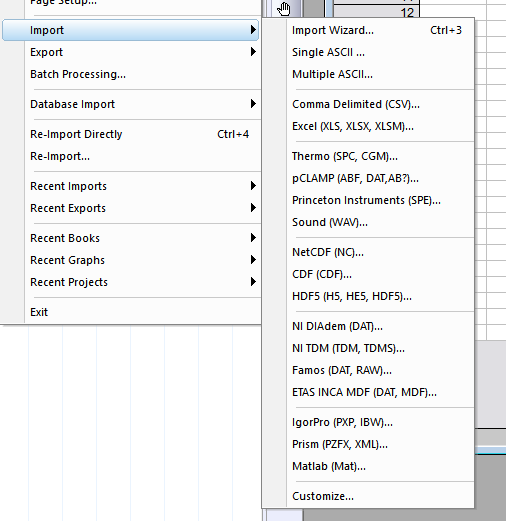 要使用Origin处理数据,首先需要将实验数据导入到Origin中。向Origin中导入数据的常用方式有两种:第一种是用户通过新建数据表并直接将数据复制粘贴到数据表中,第二种是用户通过导入Excel表或txt文件将数据文件导入到软件中。在导入文件数据时,可以直接将文件拖拽到Origin中,也可以点击工作界面菜单栏中的对应按钮【File】→【Import】,选择本地文件进行导入,如图2所示。