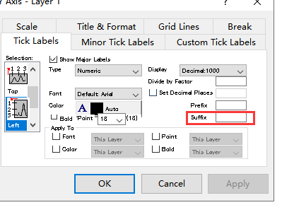 为了使统计图更加美观,我们运用Origin绘图时,除了使用默认的横坐标和纵坐标以外,还可以为统计图添加上边框和右边框。具体操作是将光标置于横坐标或者纵坐标上后双击鼠标,此时会弹出如图7所示的设置框。