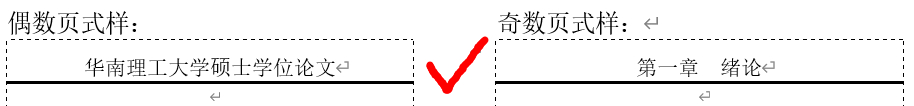 (五)页眉页脚 1. 页眉不规范:应该遵守奇偶页数的规律,奇数页的页眉应为本页对应的章标题,偶数页的页眉应为“华南理工大学硕士学位论文”;