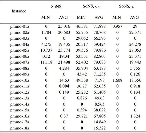 图6 SoNS算法与大多数学习优化算法对比 此外,不同于目前学习优化方法中将FJSP建模为纯随机的马尔可夫决策过程,SoNS算法采用基于搜索的求解方式,用机器学习方法实现了有效决策子集的定位,降低了同类研究方法中以随机方式确定有效决策子集的盲目性,提高了搜索的准确性。 表1展示了不使用神经调度器的算法版本(SoNS_ns)、不采用自组织框架的算法版本(SoNS_so)以及完整版SoNS在DP-PMMO用例集上的消融性实验结果。 表1 SoNS、SoNS_ns及SoNS_so在DP-PMMO测试集上的消融性实验对比