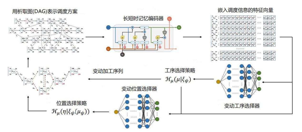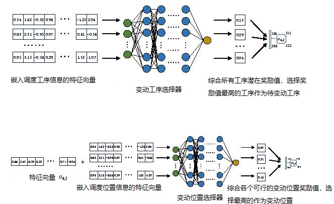 图5 NS中的变动工序选择器(上)与变动位置选择器(下) 不同于一般算法中对每个样例数据编码的方式,SoNS算法对每道工序进行编码,并通过一个长短时记忆编码器(Long Short-Term Memory encoder,LSTM)生成表征该工序的特征向量,从而实现了将变维度的结构化输入信息转化为定长嵌入特征向量的效果。大多数学习优化算法总是希望通过学习的方式产生更优解,然而,这种思路在组合优化问题上难以获得成功,因为该类问题输入输出空间度量是不一致的。而SoNS算法通过机器学习确定解搜索的决策子集,使得算法可以在通过LSTM生成定长特征向量后,仅训练一个模型就可以处理不同规模的问题,较好地避开了空间度量不一致的巨坑。