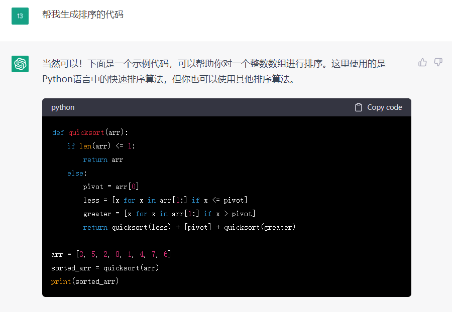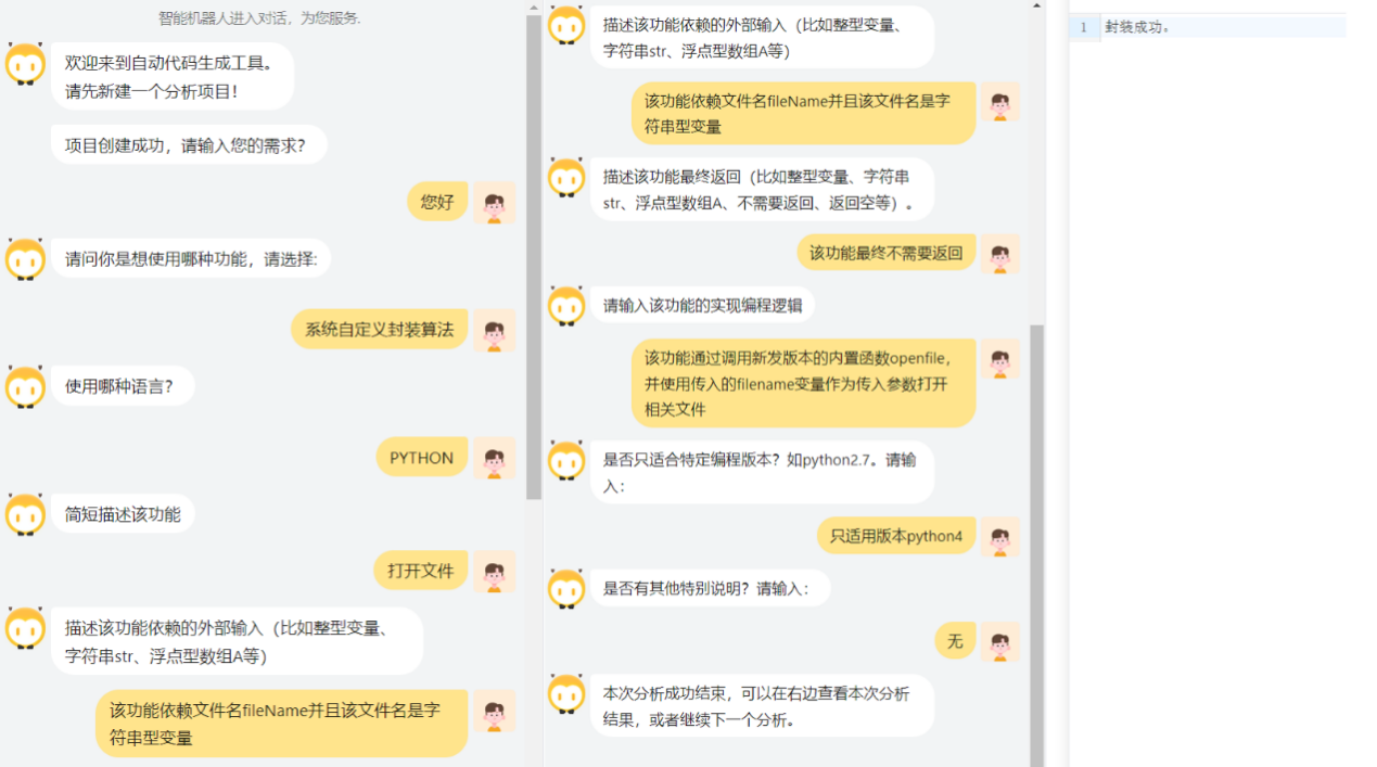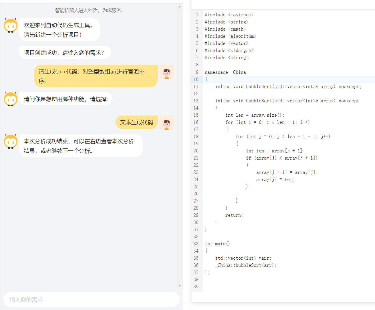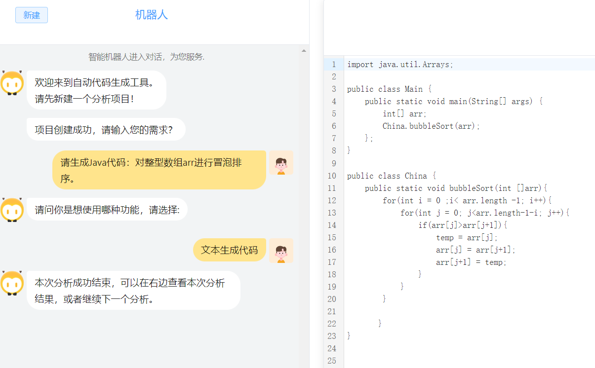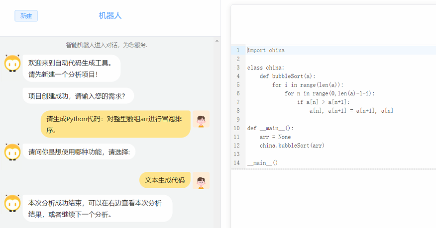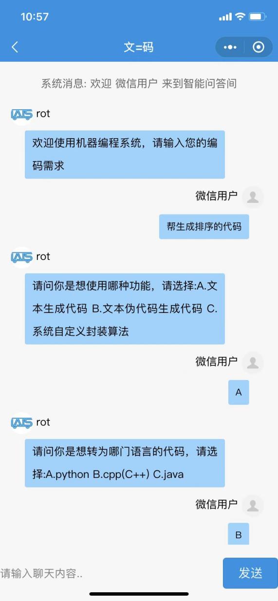 自动编码是一项机器根据用户给定的软件需求自动生成相应程序源代码的任务。它是一种提高软件开发自动化水平和产品质量的重要方法,一直受到学术界和工业界的广泛关注。智能算法研究中心一直致力于智能化软件工程的研究,近期研发了一款基于人机交互的代码生成系统——“文=码”系统(下文简称“文码”)。该系统首先对用户的软件需求进行语义解析,并通过对话的形式引导用户修正文本以削弱文本的二义性与 完整性,然后自动提取文本的程序逻辑,最终通过结合编程语言的语法规则来生成相应的程序源代码。而当前爆火的对话式大型语言模型ChatGPT也因擅长编程而“出圈”。面对同样的任务,我们的系统与ChatGPT谁能更胜一筹呢? 一、与用户需求的匹配度 提问:帮我生成排序的代码