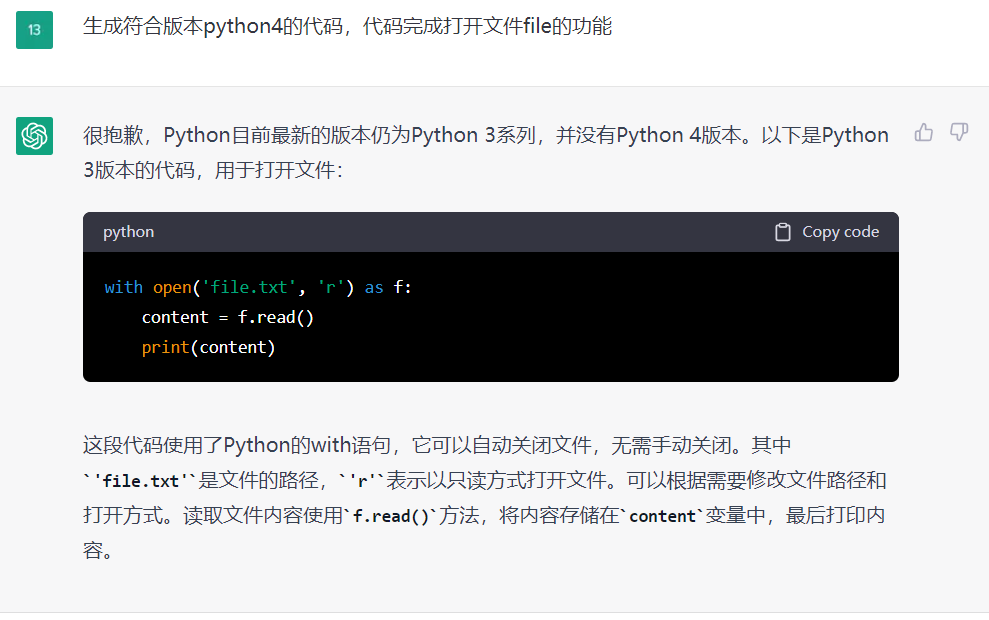 由 ChatGPT 与文码的反馈可知,两者均接收了内置函数open更改为openfile的新知识。接下来,我们在新对话中验证两个系统是否已经更新了编码知识以及能否将新知识用于后续的自动编码任务。 提问:生成符合版本 python4 的代码,代码完成打开文件 file 的功能