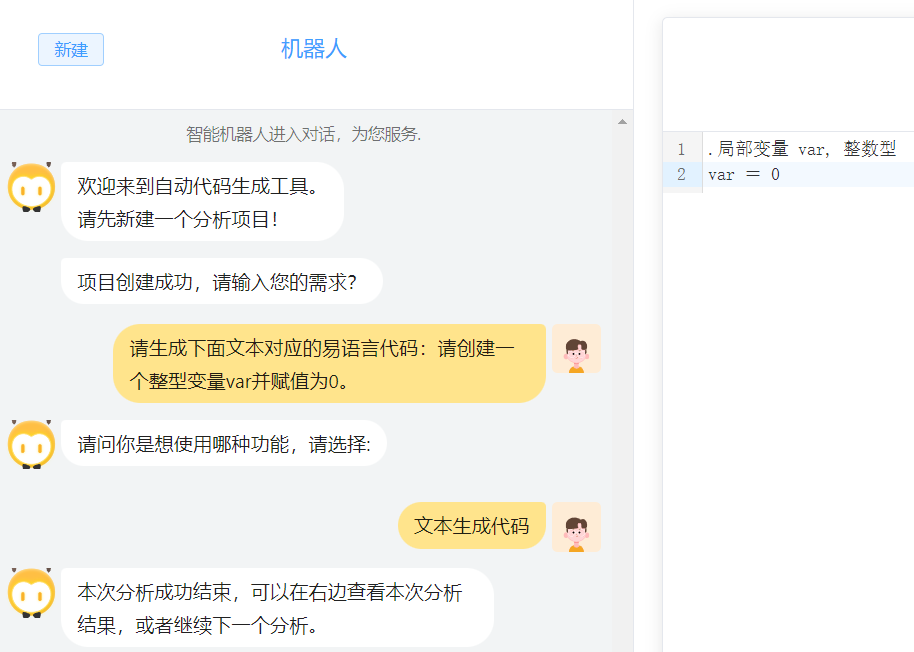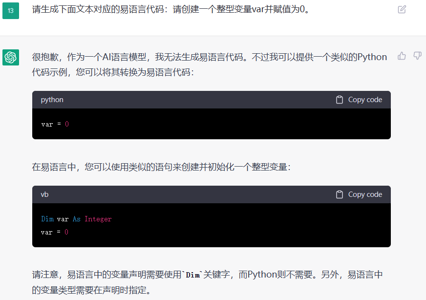 由以上结果可知,文码与ChatGPT均能正确生成可编译的程序源代码,二者所生成的内容并没有显著差异。 此外,当前编程语言已有数百种,且在不断更新,所以移植到新编程语言的可扩展性也是衡量系统性能的重要指标。我们以两个系统训练语料均未覆盖的中文编程语言(易语言)来测试两者能否在不重新训练的前提下生成相应代码。 提问:请生成下面文本对应的易语言代码:请创建一个整型变量var并赋值为0
