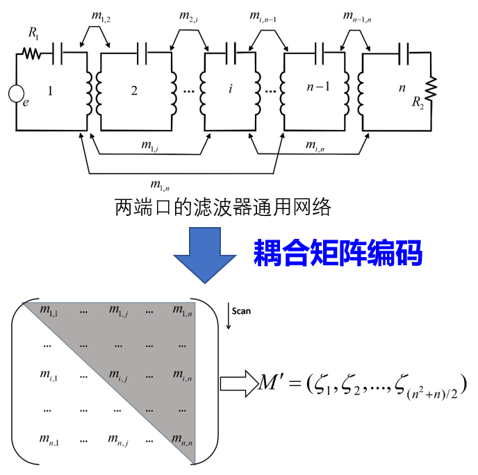 以图3所示两端口微波滤波器的通用原型网络为例,表示微波滤波器中谐振器的数量,、和是微波滤波器的基本电路元件。表示第个和第个谐振器之间的耦合系数。这些耦合系数组成的耦合矩阵(公式(1))反映了谐振器之间复杂的耦合关系。