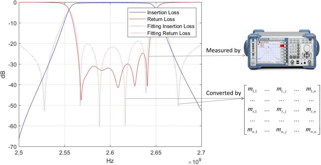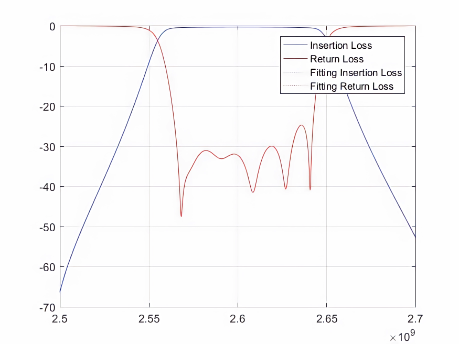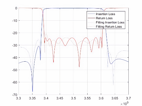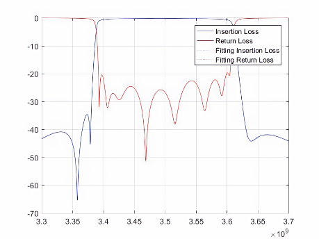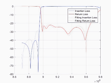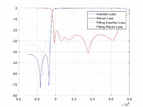 其中,红色和蓝色实线表示实际散射数据,虚线表示拟合的散射数据。实线和虚线的重合度越高就意味着自动微波滤波器的调优精度越高,也意味着该自动微波滤波器的质量越好。因此,该模型对于多版本的微波滤波器可行。