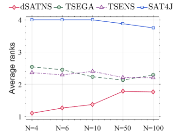 dSATNS算法结合了两类多样性求解器,依概率调用rSAT4J [2]和ProbSAT。其中,rSAT4J是随机化版本的SAT4J [3],旨在产生