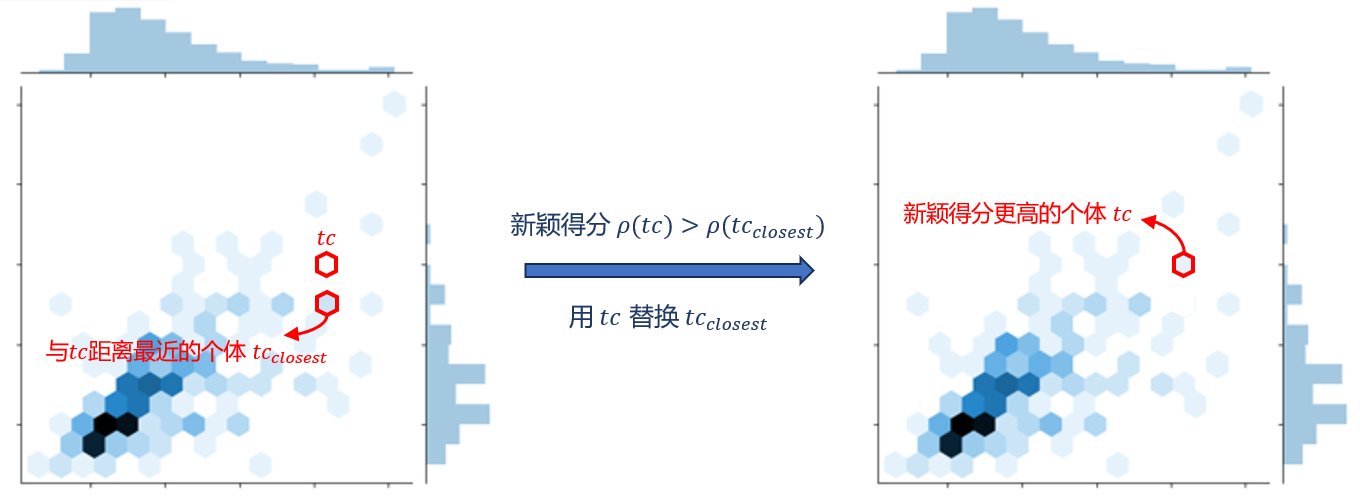 dSATNS根据NS算法采用了两种归档策略GlobalArch(见图3)和LocalArch(见图4),分别考虑了测试集的全局多样性和局部多样性。新颖得分是NS算法中的核心概念,度量个体所在区域的拥挤程度。新颖得分越高,说明个体所在区域越稀疏,反之则越密集。GlobalArch通过不断搜索新颖得分更高的个体并替换,提高了测试集的整体多样性,但忽略了新个体所在区域的局部信息。新个体的加入可能会导致出现局部聚集的现象,而在LocalArch的策略中,新测试用例及与其最近的测试用例不能同时存在,提高了测试集的局部多样性。