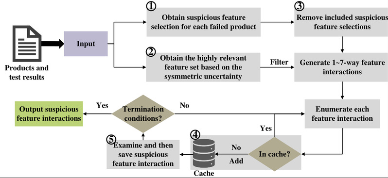 图4展示了CRFL框架,其包括以下五个部分:①基于反事实推理获取可疑特征选择;②基于对称不确定性过滤无关特征交互;③利用包含关系移除包含型可疑特征选择;④通过缓存机制减少冗余特征交互;⑤检查特征交互的可疑性。