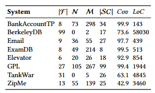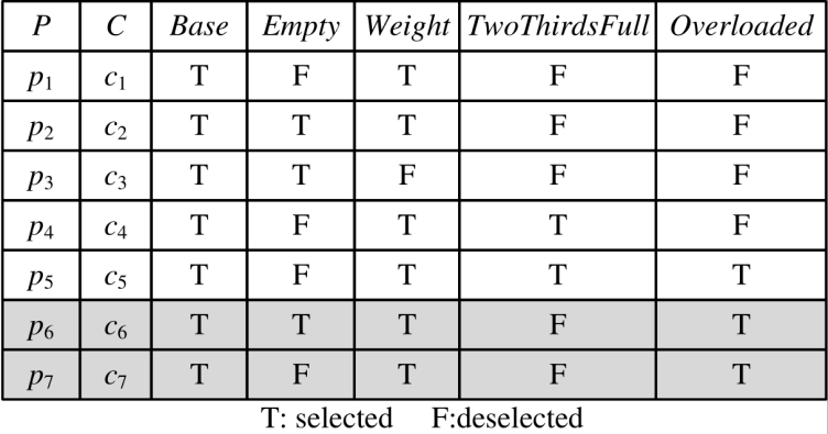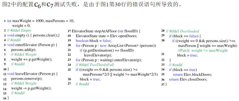 图2 采样的配置和相应的测试结果 在图1中,#ifdef指令通过控制特征的选择或取消选择来实现系统功能。该系统包含五个特征:Base、Empty、Weight、TwoThirdsFull和Overloaded。其中,Base控制基本功能,Empty支持电梯在空载状态下的运行,Weight控制电梯在有载状态下的运行,TwoThirdsFull和Overloaded分别控制当载重达到最大负载的三分之二以及超过最大负载时的运行。第 30 行中的语句weight==maxWeight不符合系统设计逻辑,应修改为weight>=maxWeight。由于该错误属于可变性错误(variability bug),并不会在所有配置中导致缺陷,仅在选择了特征Overloaded的配置中可能引发测试失败。影响第 30 行正常执行的变量为Weight,该变量同时受特征Weight和TwoThirdsFull的控制,表明它们与Overloaded存在交互关系。具体而言,仅当Weight=T、TwoThirdsFull=F 且Overloaded=T 时,配置才会出现失败。需要注意的是,Overloaded只能在Weight被选择的前提下被选择。因此,实际导致缺陷的特征交互为 (-TwoThirdsFull, Overloaded),其中“-”表示特征未被选择。
