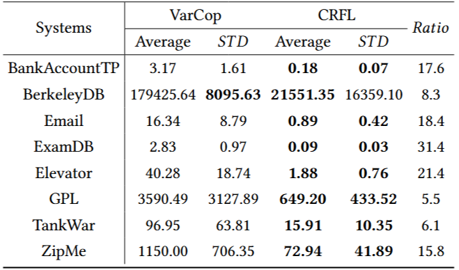 为确保公平,所有的实验均在同一台硬件设备下完成,结果如下。 对于效率,表2展示了 CRFL 和 先进的方法(VarCop, TSE, 2022)在八个系统上的平均运行时间(单位:秒),以及 VarCop 与 CRFL 的运行时间比值。此外,表中还给出了标准差(STD),其中STD越小表示方法的稳定性越高。如表2所示,CRFL在平均运行时间和STD两个指标上均优于VarCop。特别地,CRFL的标准差明显低于VarCop,进一步体现了其稳定性。值得注意的是,CRFL 在所有系统上均显著快于VarCop,提速比范围在 5.5 到31.4之间。具体而言,对于特征数量少于十个的小型系统,如 BankAccountTP、Email、ExamDB和Elevator,CRFL 至少比VarCop快17.6 倍。对于大型系统,如GPL和BerkeleyDB,由于搜索空间呈指数级增长,两个方法均需较长时间,但CRFL 仍快于 VarCop。总体而言,CRFL在小型系统上平均提速 22.2倍,在大型系统上平均提速 8.9 倍。 表2 CRFL与先进方法在运行时间上的比较