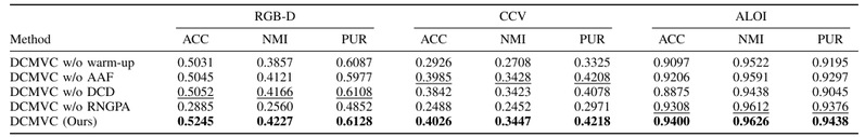 图2 双重对比学习过程中RGB-D中特征的可视化 (3)消融实验 如表2所示,移除关键模块会导致性能显著下降: · 移除DCD:ALOI数据集ACC下降5.25%。 · 移除RNGPA:CCV数据集ACC下降15.38%。 表2 消融研究