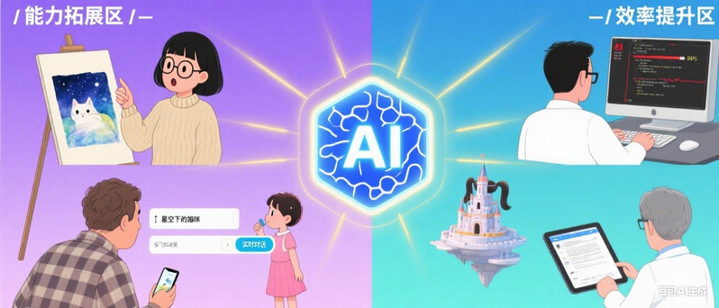 3. 总结:AI 赋能实现 “能力互补” 说到底,AI 赋能的核心不是 “AI 替代人”,而是 “AI 配合人”。当你在某件事上 “做不到” 时,AI 用它的优势帮你 “做到”,实现能力突破;当你在某件事上 “能做到但效率低” 时,AI 用它的高效帮你 “做得更快”,释放时间精力。 无论是突破边界还是提升效率,AI 都像一把灵活的工具:它不会让每个人都成为专家,但能让普通人轻松完成过去难以想象的任务;它不会替代专业人士,但能让专业人士把才华用在更有价值的地方。理解了这两种赋能逻辑,我们就能更清晰地找到 AI 在生活和工作中的位置 —— 不是盲目追逐潮流,而是让它真正成为解决问题的帮手。 下次再听到 “AI 赋能”,不妨想想:它是在帮我突破能力瓶颈,还是在帮我节省重复劳动?想明白这一点,你就掌握了玩转 AI 的关键。