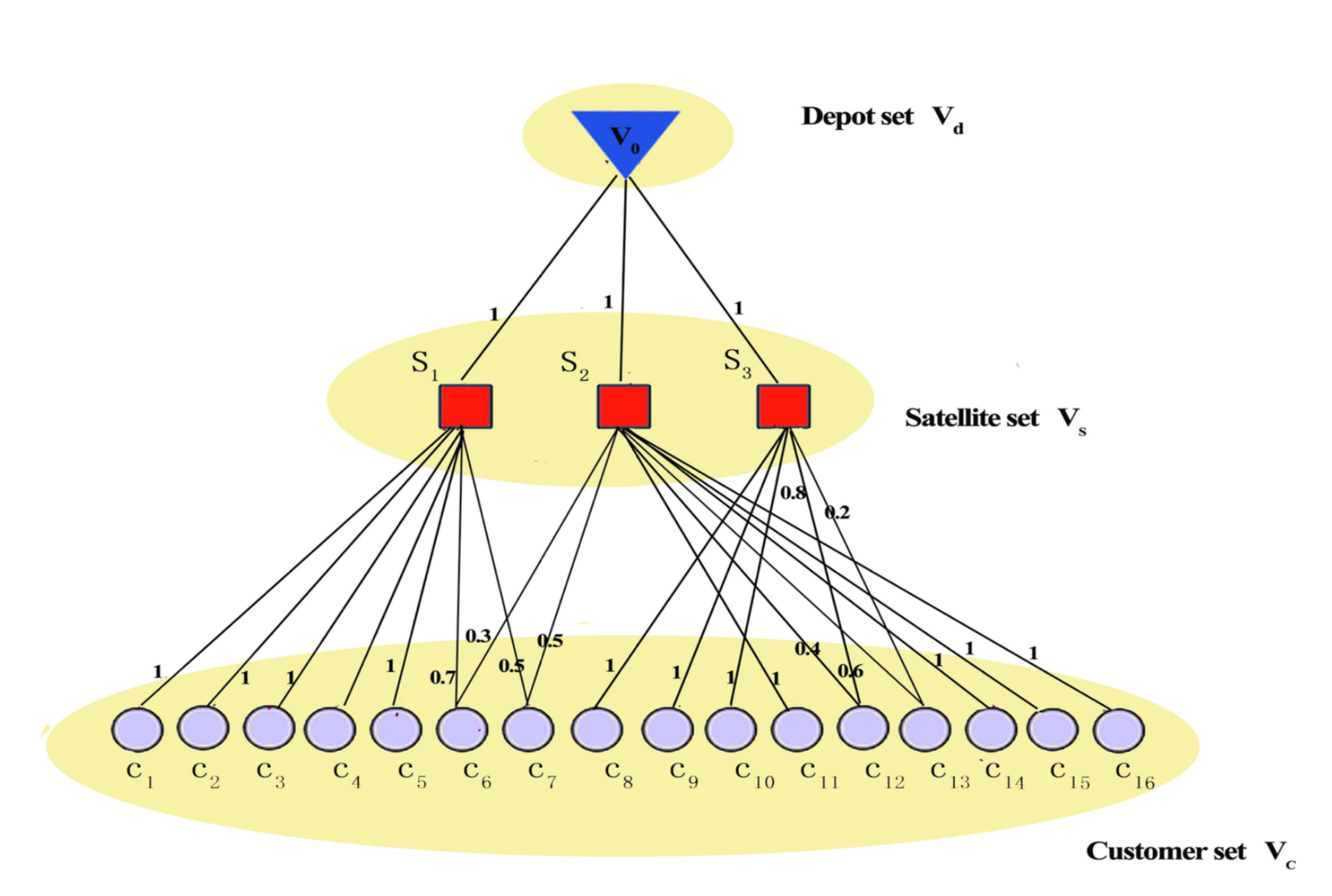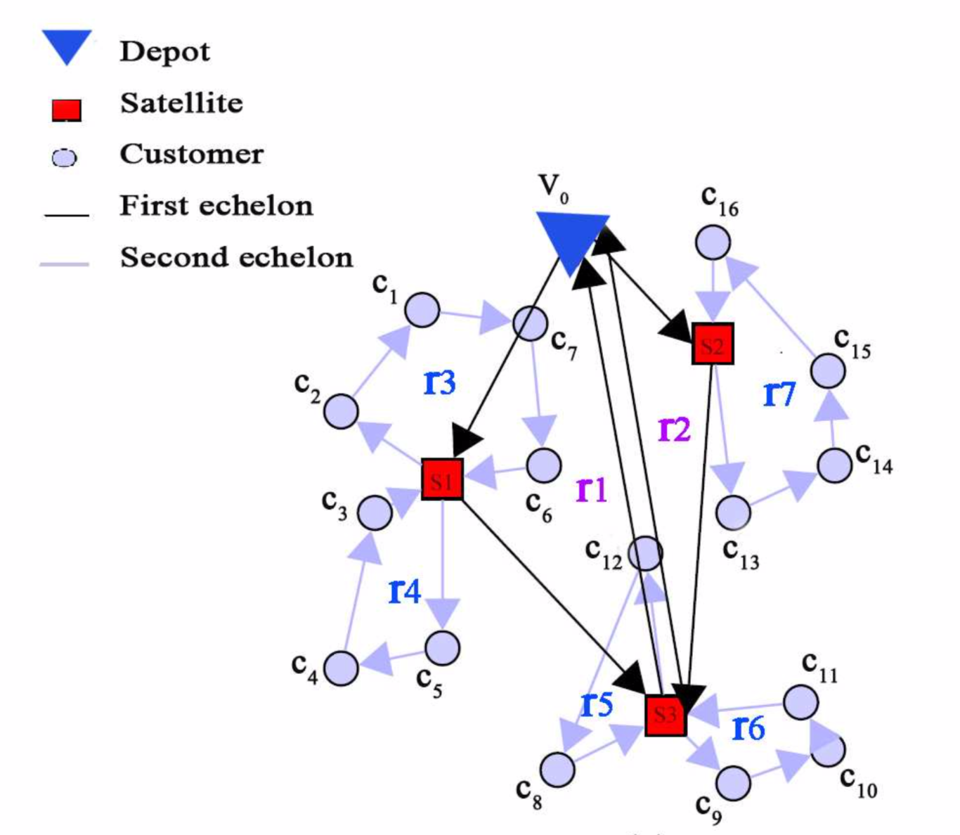 随着物流领域的不断发展,越来越多的货运车辆投入到城市物流运输之中,尽管这样的趋势在一定程度上给城市物流带来了极大的便利,但同时也给城市交通管理和环境保护带来了巨大的挑战。因此,研究人员提出了一种双层次物流配送系统,该系统首先由大型货车将货物从仓库运送到中转站,再由中转站的小型货车进行配送来完成最后一段货物运输。这种双层次物流配送系统可以有效地把大型货车限制在城外,一定条件下减少了大型货车在城市内的行驶里程。然而构建双层次物流配送系统往往需要求解双层次车辆路径规划问题(2E-VRP),该问题是一种比经典路径规划问题更复杂的NP难问题。