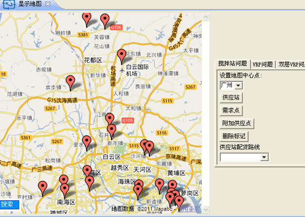 图七 物流多层调度方案演示软件示意图 案例一为物流多层调度方案演示软件,如图七所示,该案例结合相关的智能算法来解决实际问题,如搅拌站选择问题、单层车辆路径问题、双层车辆路径问题等。目前,该成果已经成功应用在广州、南宁等多个重要城市的规划设计方案中,大大提高了规划的质量与工作效率,取得明显成效。不仅如此,该项成果还成功应用在国内知名物流企业的冷链物流系统中。