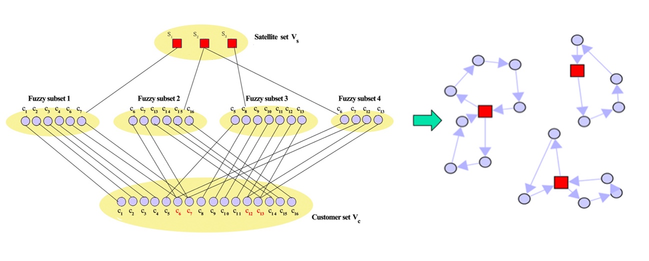 图一 2E-VRP可行解示意图 如图一所示,2E-VRP可以用一个加权的无向图G(V, E)来表示,其中V和E分别代表顶点集和边集。顶点集V由仓库节点V0、m个中转站的子集VS和n个用户的子集Vc组成; 边集E = {E1,E2},其中,E1为第一层路径组成的边子集,E2为第二层路径组成的边子集。2E-VRP问题可以简单理解为在给定约束条件下设计第一层和第二层路线的整体规划。然而考虑到不同运输层的车辆数以及车辆的载重量有所差异,第二层路径上的VRP子问题个数往往是不确定的,因而仅仅通过距离信息或其他简单的信息是很难将第一层与第二层的VRP子问题完全分离,这就给构建双层次物流配送系统的研究带来了巨大的挑战。不仅如此,随着2E-VRP问题规模的增加,中转站-用户之间的分配关系也会变得更加复杂。 针对上述问题,华南理工大学软件学院智能算法实验室提出一种基于图的模糊进化算法(GFEA)[1],该算法借鉴一些求解2E-VRP问题算法的优点,如ACOS[2],BSOA[3],BCA[4]等,从用户之间的模糊相关性出发,探索大规模物流配送路径问题的高质量可行解,为智慧城市的物流配送提供了技术支撑。目前该研究成果已成功发表在进化计算领域顶级国际学术期刊IEEE Transactions on Evolutionary Computation(JCR中科院一区,影响因子8.124)上。下面我们对本研究工作的相关成果展开介绍。