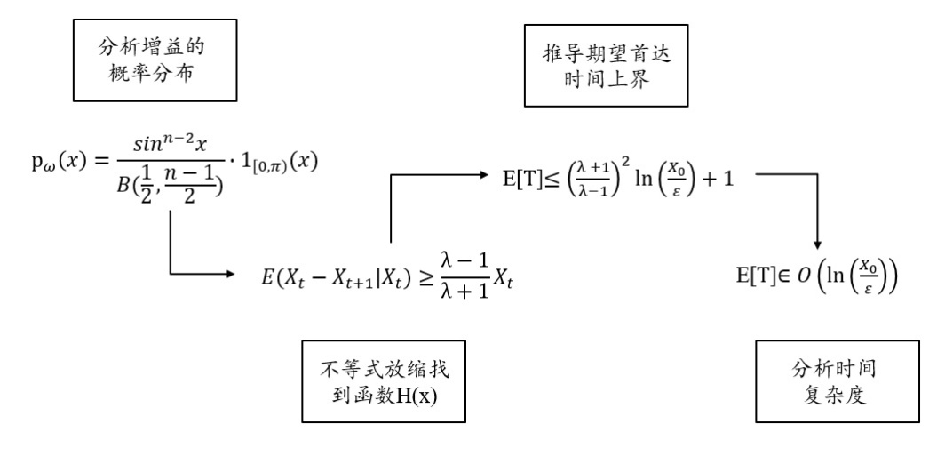 图三 各进化算法分析策略适用范围的韦恩图 首先我们简要介绍采用数学推导方式来分析进化算法的计算时间,其流程如图四所示。该过程先分析每次迭代中解的概率分布,然后推导算法在一次迭代中向全局最优解所靠近的距离的期望(平均增益),计算达到目标精度所需的迭代次数,最终借助渐进性符号来表示计算时间。