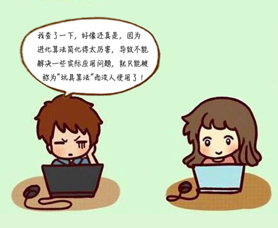 图一 进化算法的应用场景示例 尽管进化算法已被广泛地应用于现实工业问题,但该类算法的理论分析却相对滞后,例如,时间复杂度的估算就是困扰了进化计算领域五十多年的难题。而计算时间复杂度是算法应用时所必需的名片,因此有必要对实际应用中的进化算法进行时间复杂度分析。 由于进化算法的随机性以及搜索算子的复杂性,计算时间复杂度的分析过程往往繁琐而艰难。因此大部分理论工作只能针对简化后的进化算法进行分析,例如在每次迭代中仅产生一个新解的(1+1) EA [2]。然而,简化后的算法性能有所下降,不适用于求解实际问题,因此常被称为“玩具模型”。据统计,在我们查到的30余篇讨论(1+1)EA的论文中,尚未发现将(1+1)EA用于解决实际优化问题的工作[3,4]。另外,少数几篇论文讨论了多种群EA [5,6],被讨论的算法同样很少用于实际应用,其现状正如下图二漫画所示。