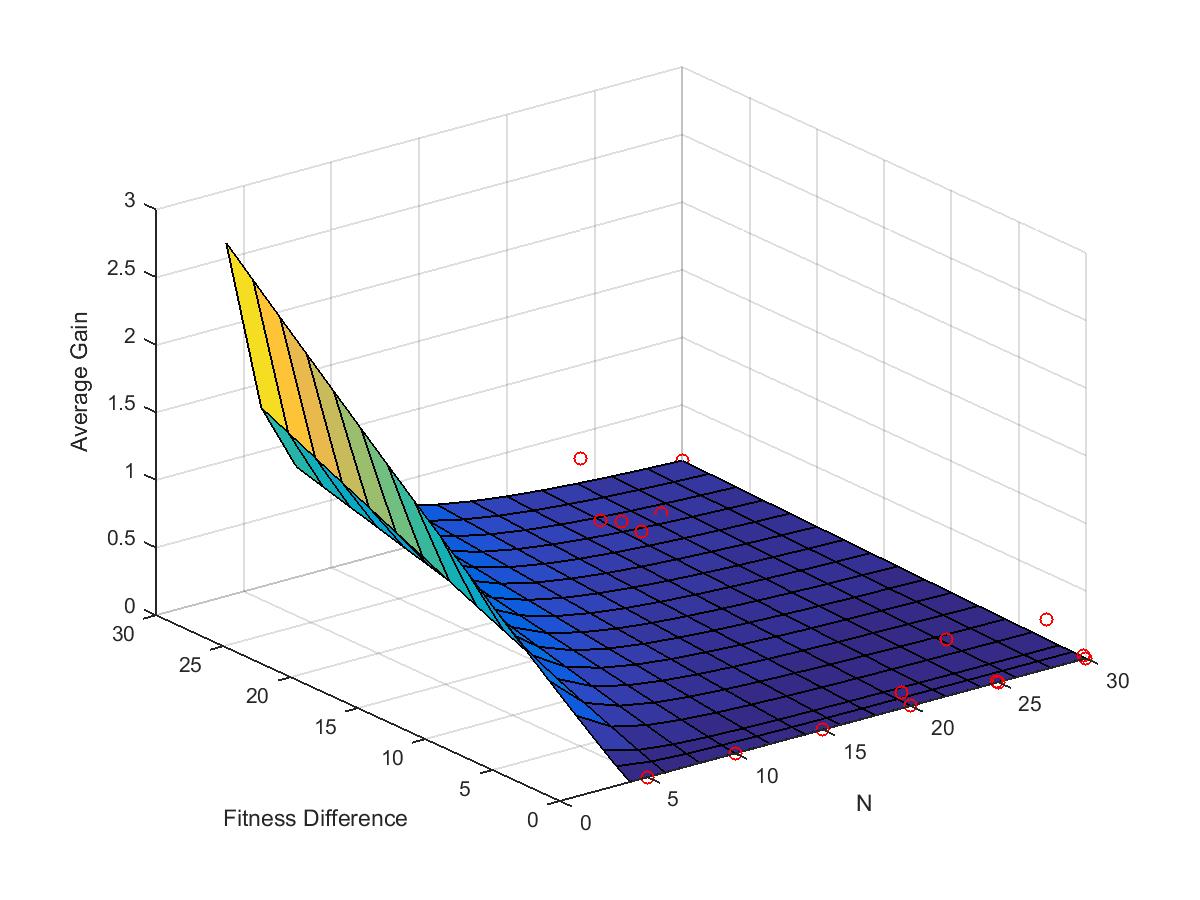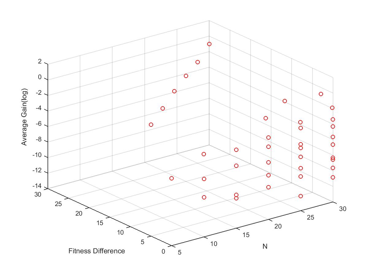 图八 取对数后平均增益关于问题维度及适应值差图 经过对平均增益数据点的拟合后,我们得到的拟合结果如公式一所示。然后根据平均增益模型定理二,可以推导出期望首达时间的上界,如公式二所示,从而得到所估算进化策略的时间复杂度。其中下面图九,图十分别展示了取对数值前后的样本点及其曲面拟合结果的图像。 公式一 最终得到的拟合结果