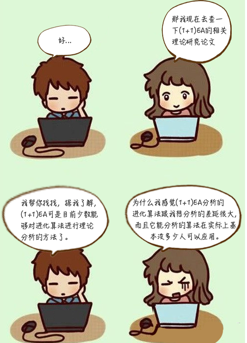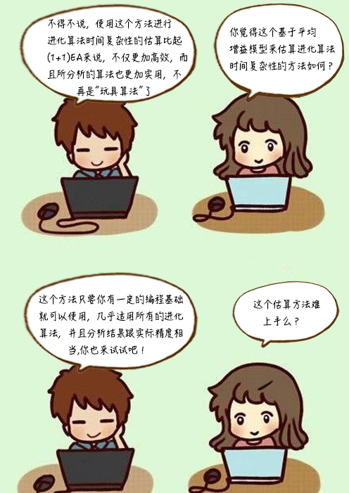 图十二 关于进化算法时间复杂度的讨论 让理论研究助力实际应用是智能算法实验室一直以来的目标,目前智能算法实验室计划搭建自动化的进化算法时间复杂度拟合平台,届时只需提供算法和问题的接口,由平台完成采样实验、曲面拟合、上界推导等工作,即可求得时间复杂度上界。正如上图十二漫画所示,之前使用数学推导来计算进化算法时间复杂度的艰难时代已经过去,现在只要你会编程就可以使用我们的方法来准确高效地分析其计算时间,从而真正打造出一项进化算法的“科学依据”——计算时间复杂度。 参考文献: