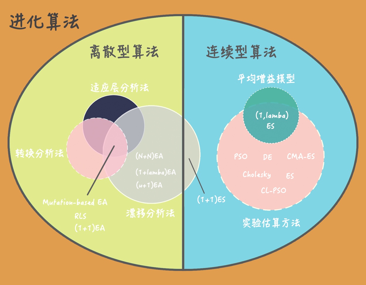 图二 进化算法理论分析的现状 即便是经过简化后的“玩具”算法,也往往需要十几页的数学推导才能得到粗略的分析结果,而实用性进化算法的分析难度更高。不过近期我们的研究成果将有望解决这一难题,届时采用我们的方法即可高效快捷地得出计算时间复杂度,并且它几乎适用于所有的进化算法。不仅如此,经过我们的验证和理论分析,最后分析得到的结果与实际结果精度相当。从此对进化算法进行计算时间复杂度的分析不再是空中楼阁。 基于上述如何去分析计算时间复杂度这个问题,我们提出了一种基于平均增益模型的连续型进化算法时间复杂度估算方法[1]。如下图三各进化算法分析策略适用范围的韦恩图所示,本项工作提出的估算方法可以分析大部分的连续型实用进化算法,实际应用更为广泛。目前,该研究成果已成功发表在进化计算领域顶级国际学术期刊IEEE Transactions on Evolutionary Computation(JCR中科院一区,影响因子8.124)上。下面我们对本研究工作的相关成果展开介绍。