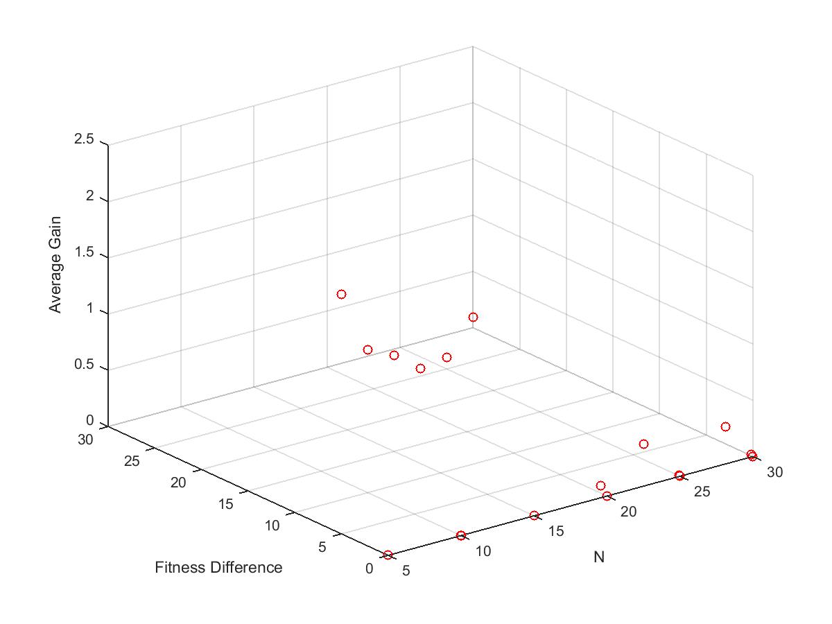 图六 采样实验的流程示意图 根据论文[1]中的定理一表示,如果已知增益的分布,且找到满足特定条件的函数H(x),那么算法的计算时间上界为函数H(x)倒数的积分加一。因此,基于此前收集到的增益样本点,本次实验估算方法采用曲面拟合技术来获得满足条件的函数H(x),从而得到所需求的期望首达时间上界。 下面我们以标准进化策略算法求解球形函数为例,展示该估算方法的使用过程。首先我们遵循上述采样实验的步骤来收集增益的样本,图七展示了所得的平均增益关于问题维度及适应值差图像。接着为了更好地体现数据的特征,我们在图七的基础上对平均增益的数值取以为底的对数,最终得到的效果如图八所示。