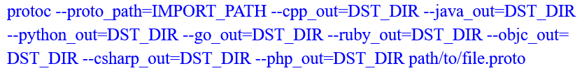 最后,执行图5中的编译指令后,我们就可以在相应的目录下找到生成的对应语言的代码文件。该文件中包含了对不同message的进行定义、修改、访问等操作的方法。图5中的IMPORT_PATH表示import文件的搜索目录,--cpp_out、--java_out、--python_out、--go_out、--ruby_out、--objc_out、--csharp-out、--php_out分别表示生成的C++、Java、Python、GO、Ruby、Objective-C、C#、phpPHP目标代码存放目录。以C++为例,执行该编译指令后会在目标目录生成file.pb.h和file.pb.cc两个文件,file.pb.h中声明了相关类和方法,file.pb.cc中定义了相关类和方法。