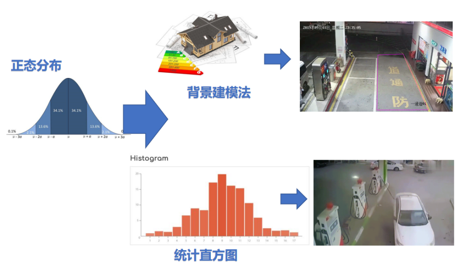 在计算机视觉中,我们经常还需要对背景进行建模,即先把计算机的原始背景记下来,检测闯入这个背景的所有移动的目标。在实际应用中,例如在智能交通中检测路上行驶的汽车是否变道、是否闯红灯、是否发生交通事故、是否非法停车等,均运用了背景建模的方法。而背景建模方法的本质就是对背景的图像特征进行建模,把背景图像特征按照不同颜色出现的次数构建统计直方图进行建模。如果把这个图画成曲线,我们很容易发现这个统计模型与统计学中的正态分布很接近。如果出现一些特定事件的特征,那么整个颜色统计直方图将会发生变化。但不管发生什么变化,都可以把颜色出现次数分布看成一个统计分布,即针对每一个视频画面都可以建立一个统计分布去刻画它包含的正常事件和异常事件。这意味着我们可以把视频事件的知识表示看成一个统计模型。所以大家在学习数理统计时,不要认为这仅仅是在抽灯泡、检验禾苗高低或摸鱼。事实上,在人工智能和计算机视觉的世界里,很多时候都是用统计模型去进行知识表示的。总之,尝试用数学来表示知识这个思想是非常深刻且有用的。
