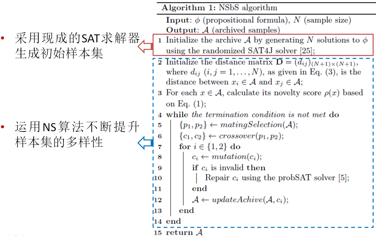 NSbS的核心思想是利用现成的可满足性(SATisfiablity, SAT)求解器快速生成一个初始样本集,即有效软件产品,然后运用搜索算法(Search Algorithms)不断提升样本集的多样性。在构建NSbS的过程中,多样性的度量和搜索算法的选择是两个关键问题。
