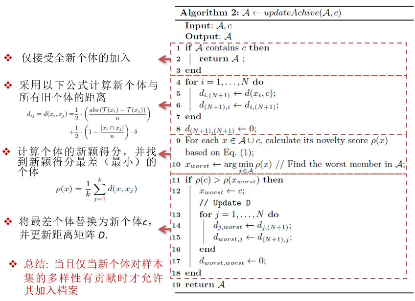 NSbS算法的流程如图2所示。该算法的基本框架与普通的进化算法高度相似,最主要的区别在于NSbS并未明确地优化某个目标函数,而是显式地提升样本的多样性。图3给出了更新档案(样本集)的伪代码。如算法2所示,只有当新个体能够提升样本集的多样性时,才将其加入档案。