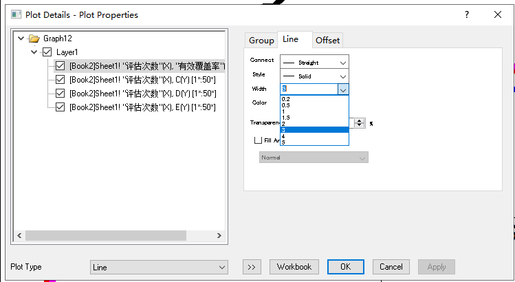 图11 修改折线图中折线的颜色 除此之外,我们还可以改变折线图中折线的粗细,使折线显示更加清晰。具体操作是在【Plot Details - Plot Properties】的设置面板中找到【Line】选项,选择合适的宽度即可,如图12所示。