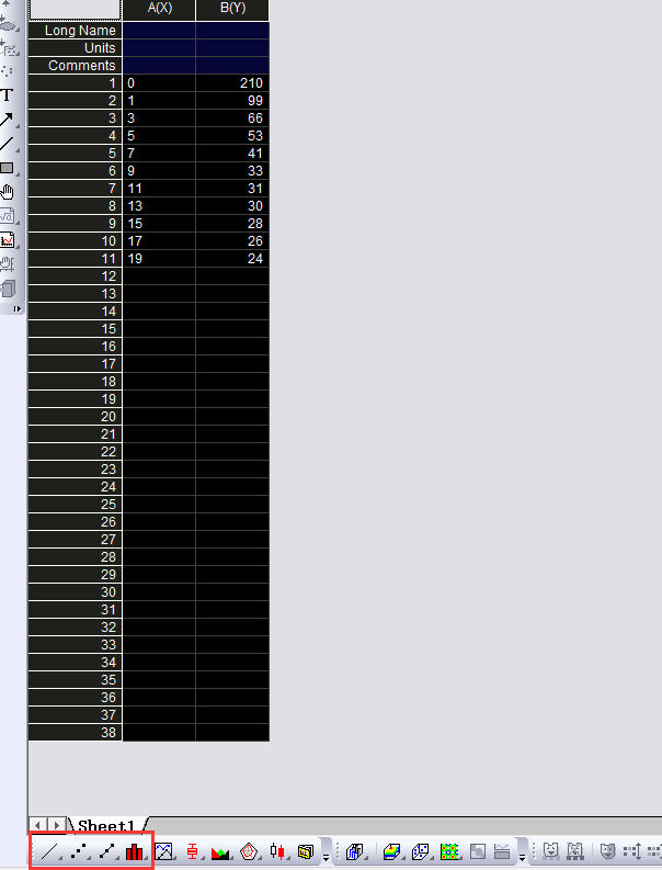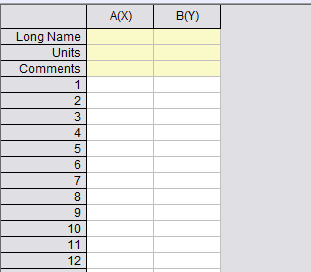 图2 Origin通过菜单栏按钮导入数据 被导入的数据会在工作表中显示。在工作表中,一般默认第一列为X轴,第二列为Y轴。如果用户还想添加新列,可以点击鼠标右键并选择【Add New Column】进行添加。 此外,工作表第一行【Long Name】表示该列名称,第二行【Units】表示数据单位,第三行【Comments】表示注释,后面的行均为数据行,如图3所示。