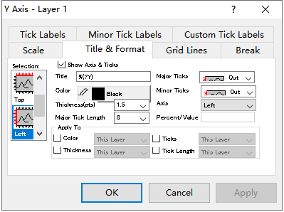 图7 统计图边框参数设置 在设置框中,我们可以选择【Title & Format】项,对上下左右四个方向的边框进行设置。比方说,选择【Top】选项,勾选【Show Axis & Tick】选项即可为统计图添加上边框。需要注意的是,如果不希望上边框出现刻度,则需要将【Major Ticks】和【Minor Ticks】参数设置为None。右侧边框的设置方法与上边框一致。图8展示了添加上边框与右边框后的折线图。