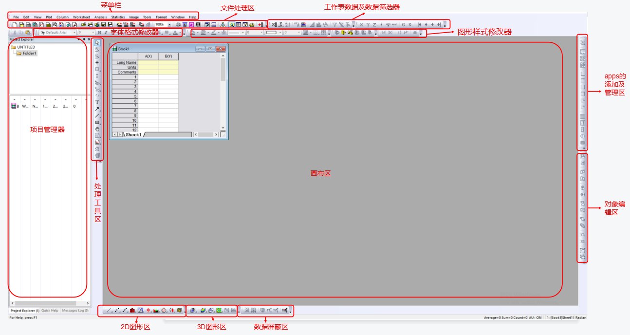 Origin是由OriginLab公司出品的一款具备数据统计、峰值分析、曲线拟合等功能的专业绘图软件,可谓是学术研究和论文写作中的一大利器。然而,很多人第一次看到这款软件时就被它复杂的界面劝退,认为该软件难以上手。其实,我们只需要稍加梳理,掌握一些基础操作,就足以完成我们所需的大多数科研制图了。我们已经将Origin的一些常用操作整理如下,希望对正在科研路上奋斗的你有所帮助。 一、工作界面 首先,让我们来了解一下Origin的工作界面。
