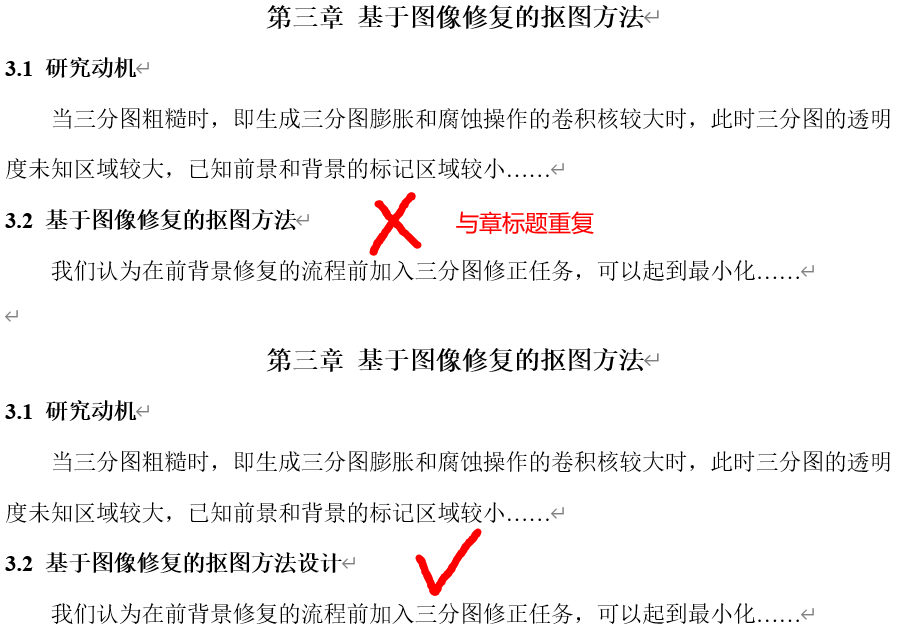 2. 标题整体框架不协调:论文题目、章、节、小节标题出现前后矛盾、重复或混乱的情况。