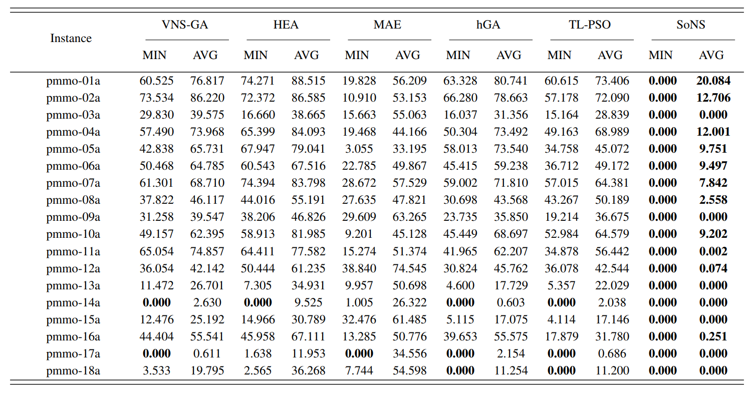 表1结果表明,神经调度器显著提升了SoNS算法的性能。同时,不采用自组织框架的算法SoNS_ns在43.8%(137/313)的测试用例上性能显著差于完整版算法,在剩余56.2%(176/313)的测试用例上性能差异不显著。 表2展示了SoNS同其他前沿调度算法在DP-PMMO测试集上的对比结果。数值实验采用柔性作业车间调度领域广泛采用的四个测试集BRData、HUData、DPData和BCData,共313个测试用例,其中用例提供的初始信息有任务数量、各任务工序数量、机器数量、各工序可加工机器集合以及加工时长等。非参数Krusal-Wallis检验被用于比较对比算法和自组织神经调度器求得的结果。实验结果显示,SoNS分别在211、219、254、184、192个测试用例上优于VNS-GA、HEA[4]、MAE[5]、hGA[6]、TL-PSO[7]算法。 表2 SoNS同其他前沿调度算法在DP-PMMO测试集上的性能对比